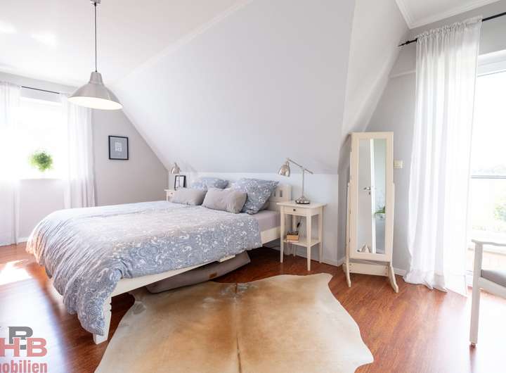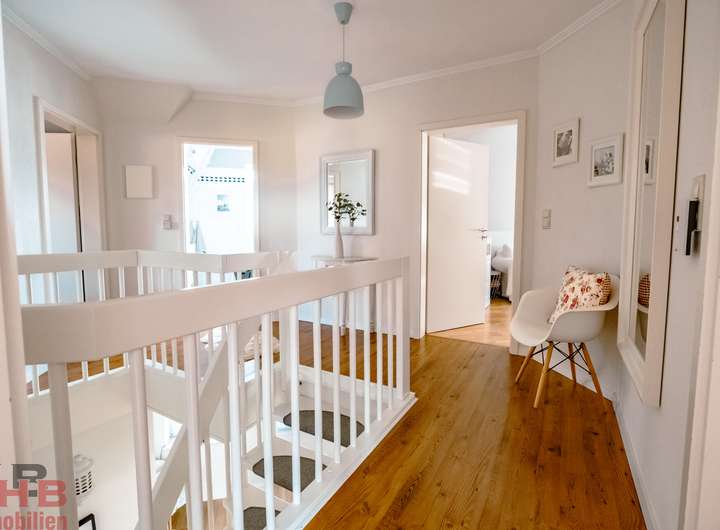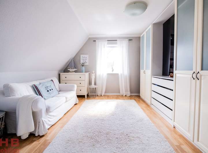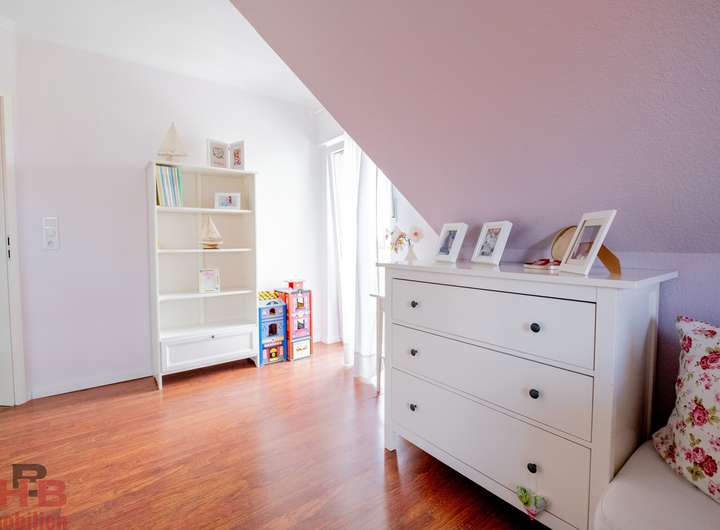 Das Obergeschoss überzeugt durch eine durchdachte Raumaufteilung: Ein helles Schlafzimmer, zwei Kinderzimmer mit Zugang zu einem gemeinsamen Balkon, ein Gästezimmer sowie das Hauptbadezimmer mit eigenem Balkon bieten Platz für die ganze Familie. Ein besonderes Highlight: Von den Kinderzimmern führen jeweils Treppen in die ausgebauten Dachgeschosse, die derzeit als zusätzliche Spielzimmer genutzt werden und den Kindern viel Raum zur Entfaltung geben.