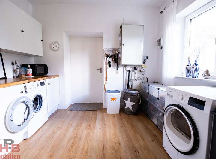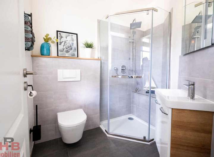 Im Erdgeschoss finden Sie außerdem ein komfortables Gäste-WC mit Dusche sowie einen Hauswirtschaftsraum mit Zugang zur Garage.