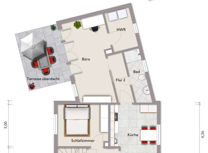 Erdgeschoss, Whg. 1 (ca. 91,92 m² Wfl.) - Wohn-/Esszimmer, 2 weitere Zimmer, Küche, Bad, HWR, Flure; überdachte Terrasse/Sommergarten