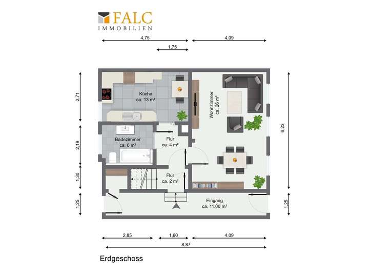 Zur Info, aufgrund der 3D-Perspektive wirken die Räumlichkeiten in der Regel kleiner als in der Realität.