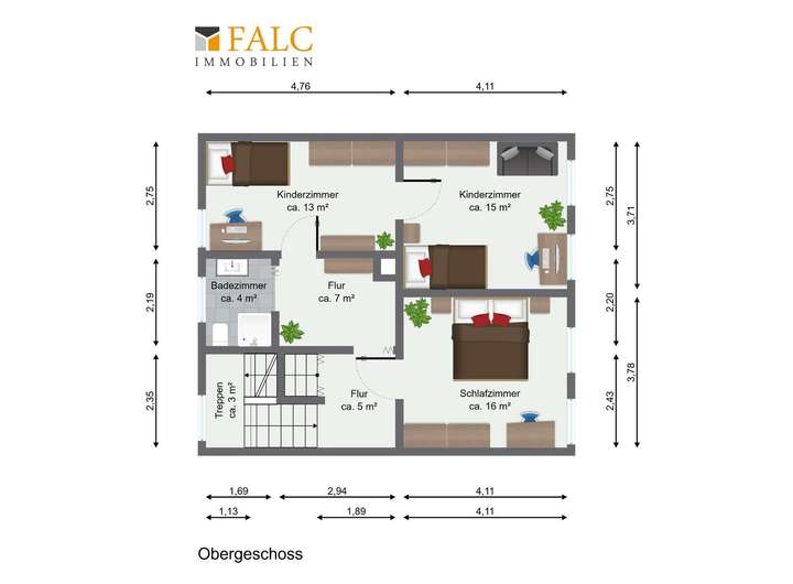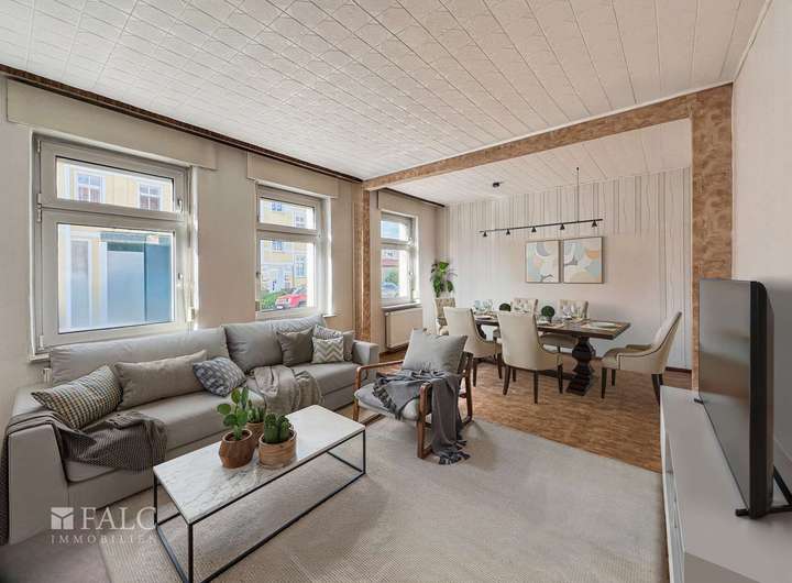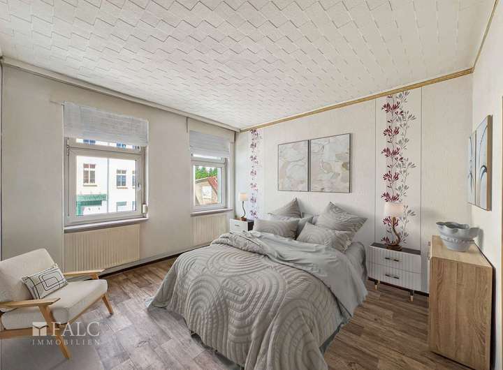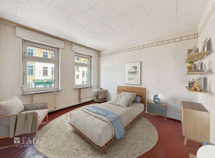 Die Möbel im Wohnzimmer, Schlafzimmer und Kinderzimmer sind digital gestaltet worden. Die Beschaffenheit der Räume ist komplett original belassen.