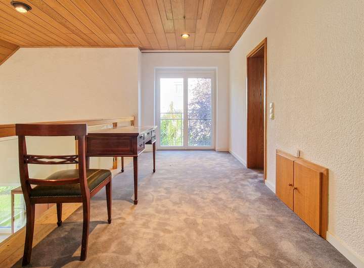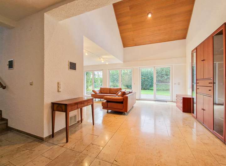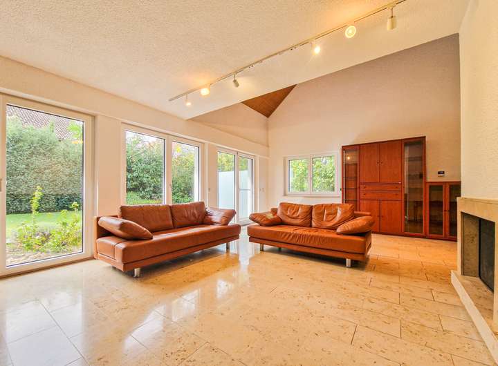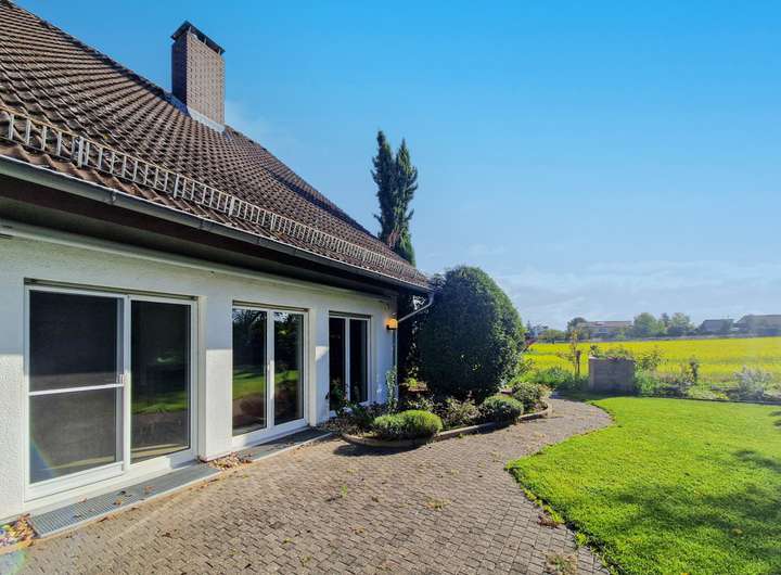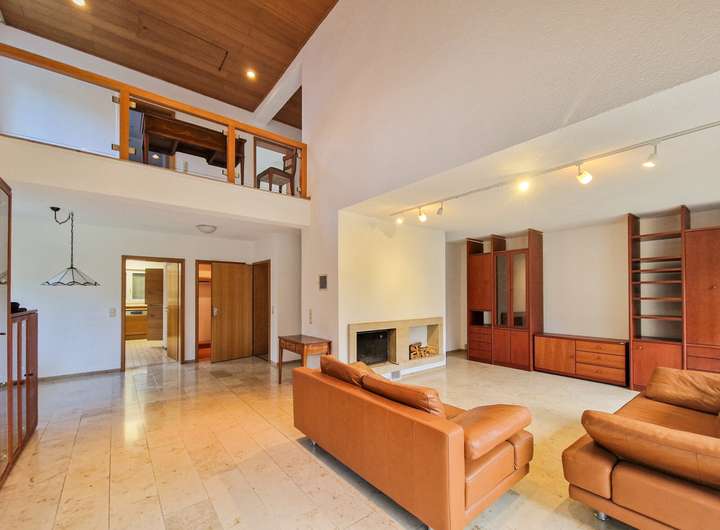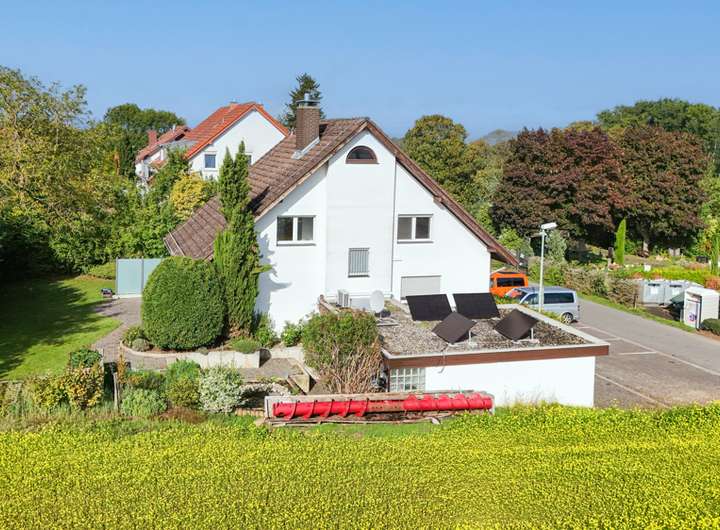 Familienhaus! Einliegerwohnung! Traumlage mit Weitblick – Ab ins Grüne! Bereits beim Betreten empfängt Sie ein eindrucksvoller Eingangsbereich mit Galerie. Hohe Decken, ein offener Kamin und die großzügige Raumaufteilung schaffen ein einzigartiges Wohngefühl. Das Haus wurde 1984 nach bis heute gültigen Standards erbaut. Elektrik, Wasserleitungen und Fenster sind somit auf einem zeitgemäßen Stand. Die Gasheizung wurde erst 2023 durch ein modernes Modell ersetzt. Zusätzlich sorgt eine Solaranlage für effiziente Energieversorgung. Der Wohnbereich wird durch insgesamt drei große Zimmer ergänzt, sodass auch größere Familien Platz zum Leben und Arbeiten haben. Im Dachgeschoss wartet eine Ausbaureserve, die sich z. B. als zusätzliches Kinderzimmer nutzen lässt. Komfortable Extras wie Fußbodenheizung, elektrische Rollläden und eine elektrische Markise unterstreichen die Wohnqualität. Der weitläufige Garten mit Teich und Gartenhaus bietet unzählige Möglichkeiten für Erholung, Spiel und Hobby. Ihre Fahrzeuge sind in der Doppelgarage bestens geschützt, auch Fahrräder und Spielgeräte finden hier bequem Platz. Ein besonderes Highlight ist die ca. 40 m² große Einliegerwohnung im Souterrain – ideal für weitere Familienmitglieder oder Gäste. Fazit: Ein einmaliges Angebot – ein echtes Familienparadies mit großem Garten, Solaranlage, Einliegerwohnung und Feldrandlage.