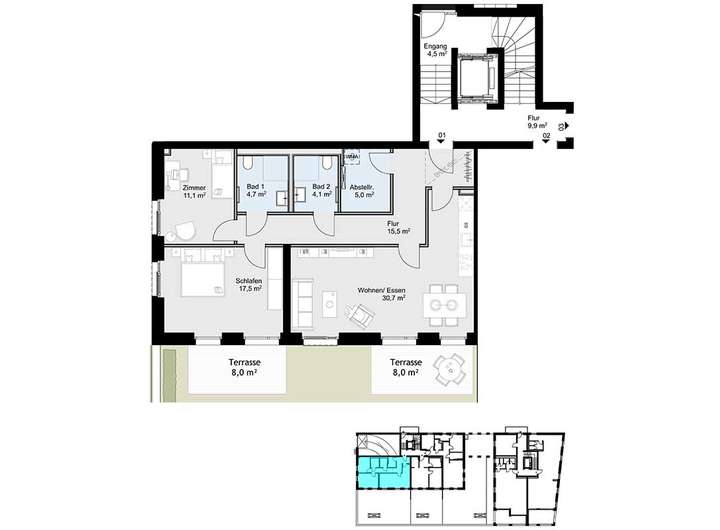 einladende Atmosphäre. Alle Wohnungen verfügen über eine Fußbodenheizung, die für wohlige Wärme sorgt. Teilweise verfügen die Wohnungen über einen Abstellraum sowie zusätzlich über ein Ankleidezimmer. Der jeweils kombinierte Ess- und Wohnbereich ist sehr gelungen gestaltet und bis zu 50 m² groß. Die Bäder bieten formschöne Sanitärobjekte von Markenherstellern (z. B. Villeroy & Boch, Grohe) und Handtuchwärmer. Hier kann man sich vom Alltagsstress entspannen und es sich einfach gut gehen lassen.