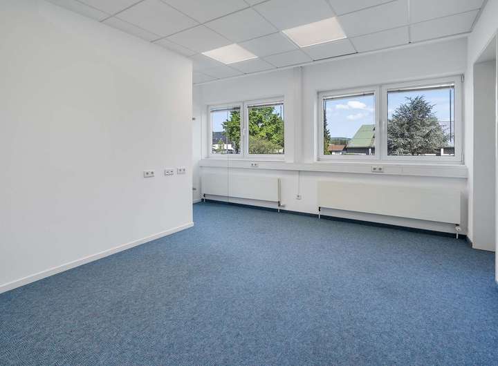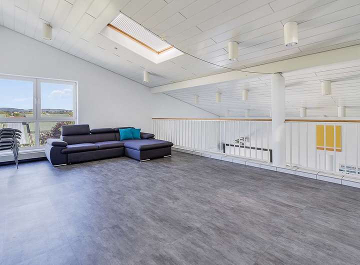 Das Hauptgebäude ist ein dreigeschossiger Gewerbebau mit ausgebautem Satteldach und beherbergt neben großzügigen Ausstellungs- und Büroeinheiten auch eine zweigeschossige Betreiberwohnung. Die Flächen im Erd-, 1. und 2. Obergeschoss sind funktional in mehrere Mieteinheiten aufgeteilt. Derzeit sind dort neben dem Hauptnutzer (Werbetechnik) auch eine Fahrschule sowie eine Praxis untergebracht. Besonders hervorzuheben ist hierbei, dass durch die geschickte Grundrissplanung die jeweiligen Geschosse bei Bedarf auch als gesamte Einheit, oder getrennt in zwei Einheiten aufgeteilt werden können. Die Wohneinheit wurde nach dem letzten Mieterwechsel frisch renoviert und im Rahmen des Verkaufsprozesses bewusst nicht neu vermietet. Hier können Sie somit bei Bedarf selbst einziehen oder einen neuen Mieter auswählen.