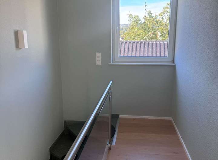 Das Erdgeschoss überzeugt mit einem großzügigen Wohn- und Essbereich, der viel Raum für geselliges Zusammensein lässt. Die offene Gestaltung schafft eine einladende Atmosphäre, in der sich Alltag und Familienleben optimal verbinden. Eine moderne Einbauküche mit Kochinsel ist bereits vorhanden und macht Kochen und Bewirten zum Vergnügen. Ergänzt wird die Ebene durch ein Gäste-WC sowie einen praktischen Vorratsraum. Vom Wohnzimmer aus gelangen Sie auf einen kleinen Balkon mit Blick ins Grüne – ein idealer Ort, um den Tag entspannt ausklingen zu lassen.