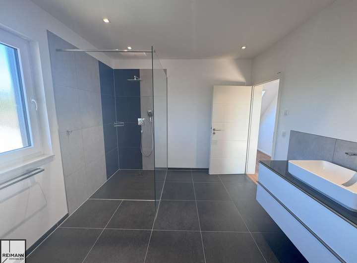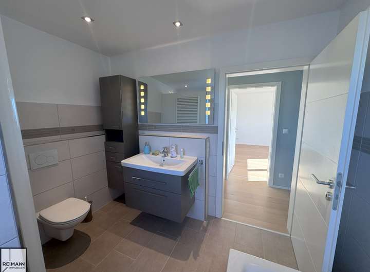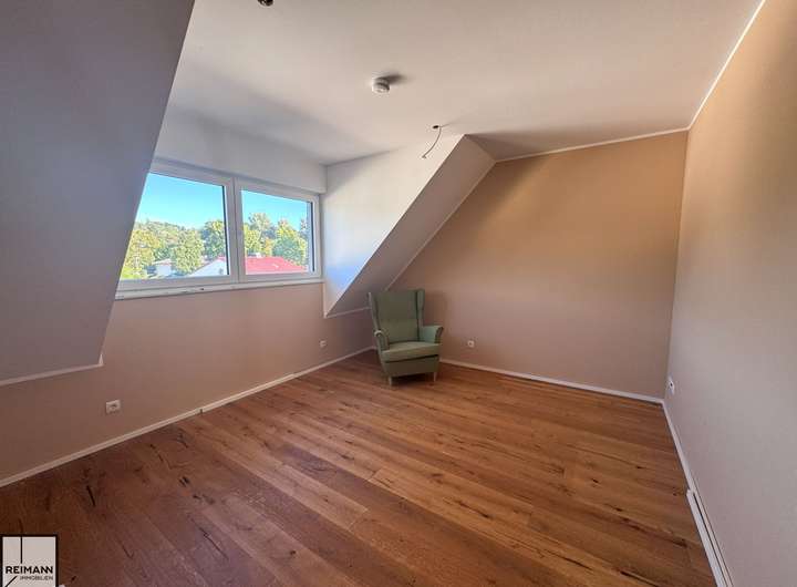 Im Obergeschoss stehen zwei etwa gleich große Zimmer zur Verfügung, die sich flexibel als Schlafzimmer, Kinderzimmer oder Büro nutzen lassen. Eines der Zimmer verfügt über einen eigenen Balkon. Auf dieser Etage befindet sich außerdem eines der beiden modernen Tageslichtbäder, ausgestattet mit hochwertiger Sanitäreinrichtung und zeitlosem Design.