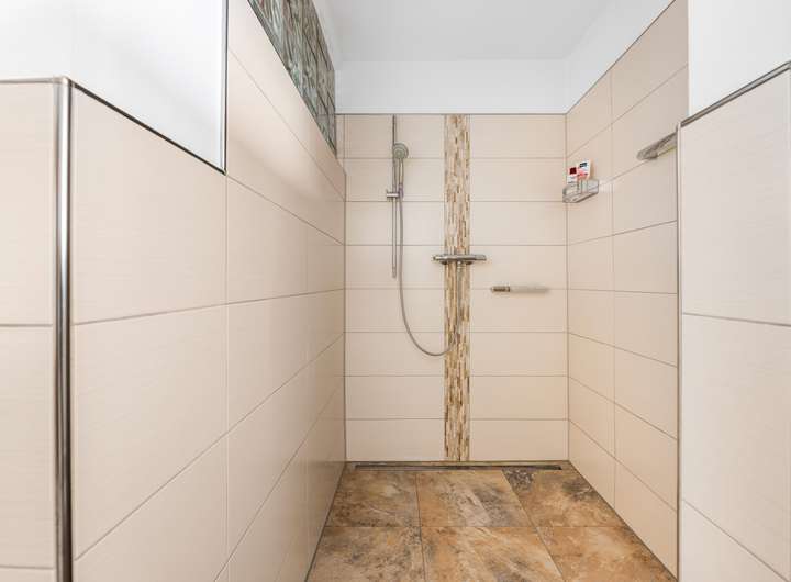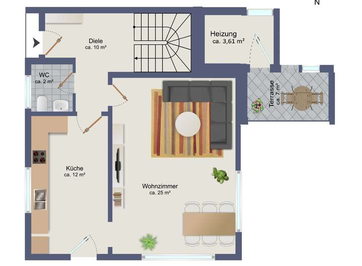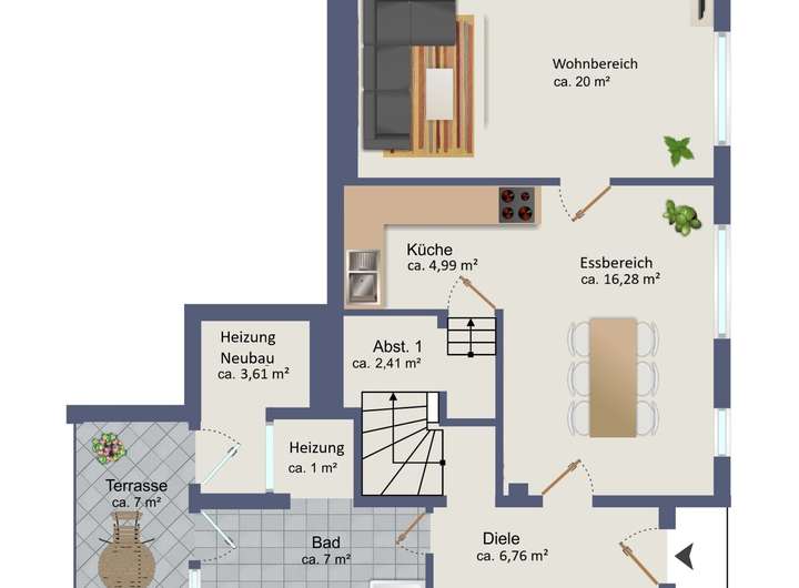 + EG: Wohnzimmer, Essbereich, offene Küche, Duschbad mit angrenzender Niesche und Heiztherme