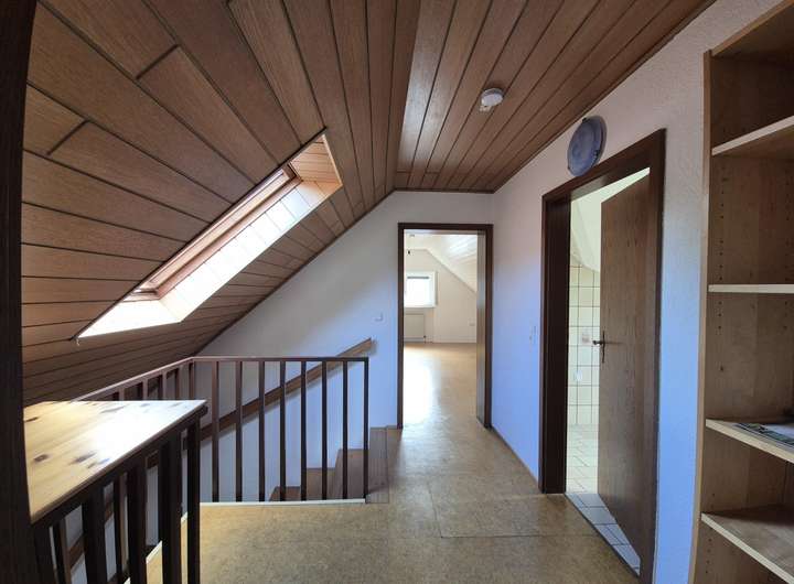 Das Erdgeschoss bietet ein geräumiges Wohnzimmer mit direktem Zugang zur Terrasse, eine Küche sowie ein Gäste-WC. Im Obergeschoss befinden sich ein großes Schlafzimmer, zwei kleinere Kinderzimmer und ein Badezimmer mit Wanne und Dusche. Das Dachgeschoss hält zusätzlich zwei Zimmer und ein Duschbad bereit.