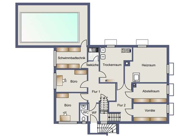 Auf rund 256 m² Wohnfläche und ca. 229 m² zusätzlicher Nutzfläche bietet das Haus ein beeindruckendes Raumangebot und eine durchdachte Grundrissgestaltung. Besonders hervorzuheben sind der hauseigene Wellnessbereich mit Schwimmhalle und Sauna sowie die vielseitig nutzbaren Flächen im Keller, ideal für Homeoffice, Praxis oder Hobby.