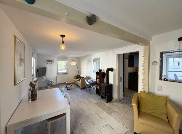 schönes Wohnzimmer, große Küche mit Zugang zur Terrasse, Tageslichtbad und Diele