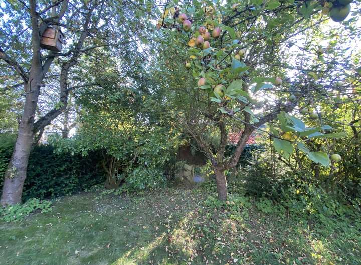 Zur Immobilie gehören eine massive Garage, ein Stellplatz sowie ein praktischer Schuppen zwischen Garage und Haus. Ein wunderschön angelegter Garten mit einem Teich und Obstbäumen in Westausrichtung