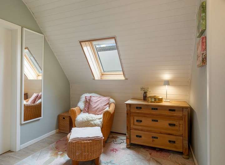 Rückzugsorte im Obergeschoss: Über eine elegante Holztreppe gelangen Sie in das Obergeschoss. Hier finden sich zwei helle Schlafzimmer mit gemütlichen Dachschrägen sowie ein freundliches Familienbad mit Badewanne. Weiße Holzdeckenpaneele unterstreichen die wohnliche Leichtigkeit dieser Etage.