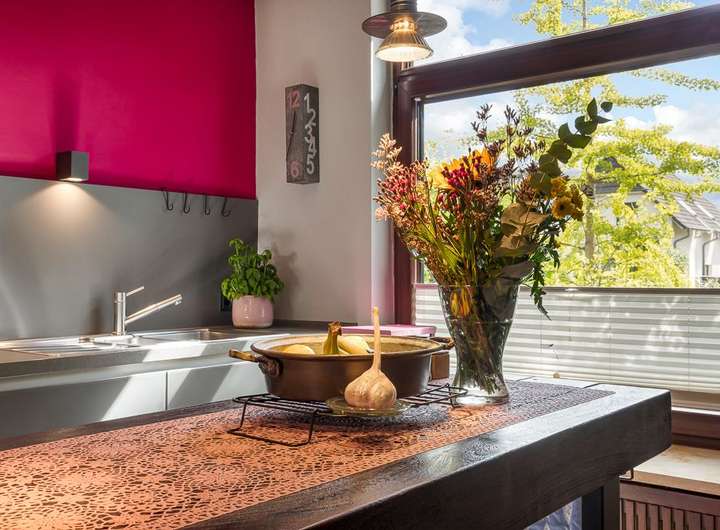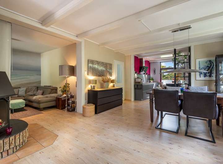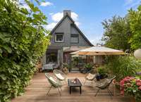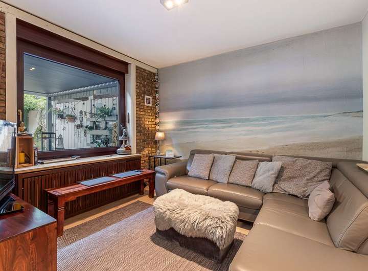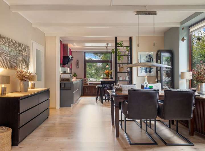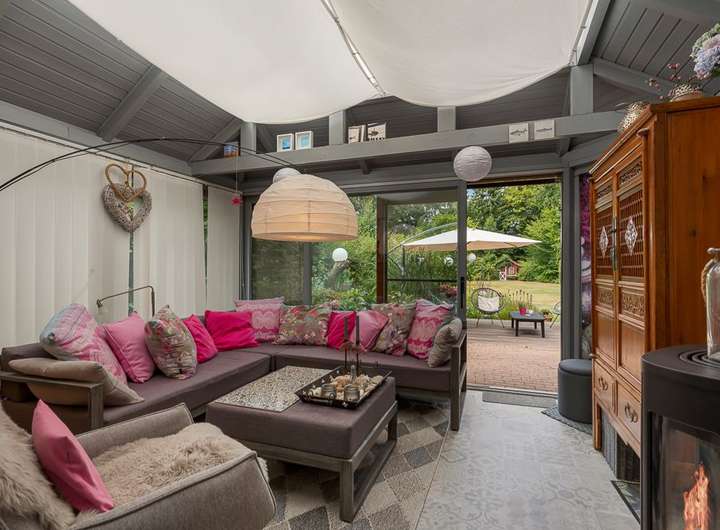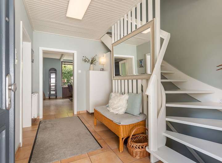 Das Haus wurde 1962 erbaut, wurde laufend modernisiert und zeigt sich bis heute gepflegt und einladend. Im Erdgeschoss erwarten Sie ein Gäste-WC mit moderner Walk-in-Dusche, ein praktischer Hauswirtschaftsraum mit viel Stauraum sowie die offene Wohnküche mit grauer Einbauküche, hochwertigen Geräten und einem zentralen Tresen. Von hier öffnet sich der Blick in den Essbereich, wo helle Holzböden und dekorative Deckenbalken eine warme, skandinavische Atmosphäre schaffen. Das angrenzende Wohnzimmer mit seiner offenen Backsteinwand dient als Rückzugsort für gemütliche Spiel- oder Leseabende. Ein weiteres Highlight ist der hochwertig erbaute Wintergarten, der mit viel Licht und einem eigenen Kamin das ganze Jahr über zum Lieblingszimmer der Familie wird.