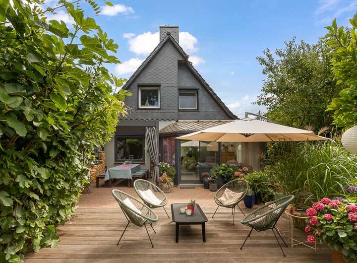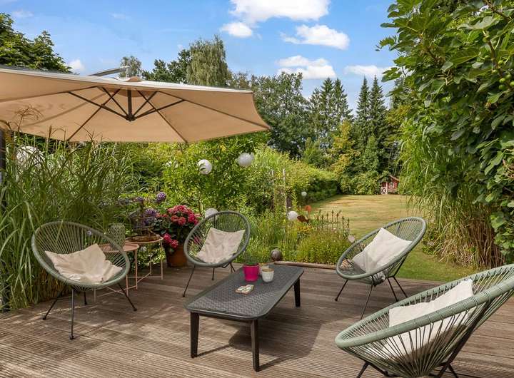Das Grundstück misst stolze ca. 1.172 m² und ist ein Paradies für alle, die gerne draußen sind. Ein prachtvoller Ginkgo, ein großer Feigenbaum und viele weitere Pflanzen schaffen eine grüne Oase, die zum Entspannen, Spielen und Feiern einlädt. Die ca. 47 m² große Terrasse ist von Gräsern und Stauden eingerahmt und bietet sowohl sonnige als auch geschützte Plätze. Besonders stimmungsvoll ist der überdachte Essbereich, in dem man selbst an Regentagen gemütlich im Freien sitzen kann.
