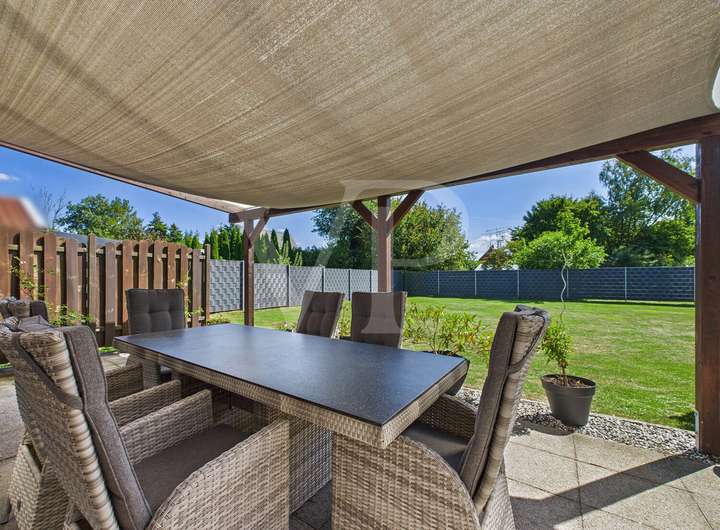 Ein weiteres Highlight ist die überdachte Terrasse sowie eine Loggia mit langlebiger WPC- und Kunststoff-Ausstattung. Der großzügige Garten lädt zur aktiven Freizeitgestaltung ein und wird durch ein separates Gerätehaus ergänzt. Drei Außenstellplätze, eine Garage mit integriertem Werkstattbereich bieten ausreichend Platz für Fahrzeuge und Hobbys.