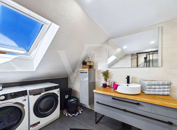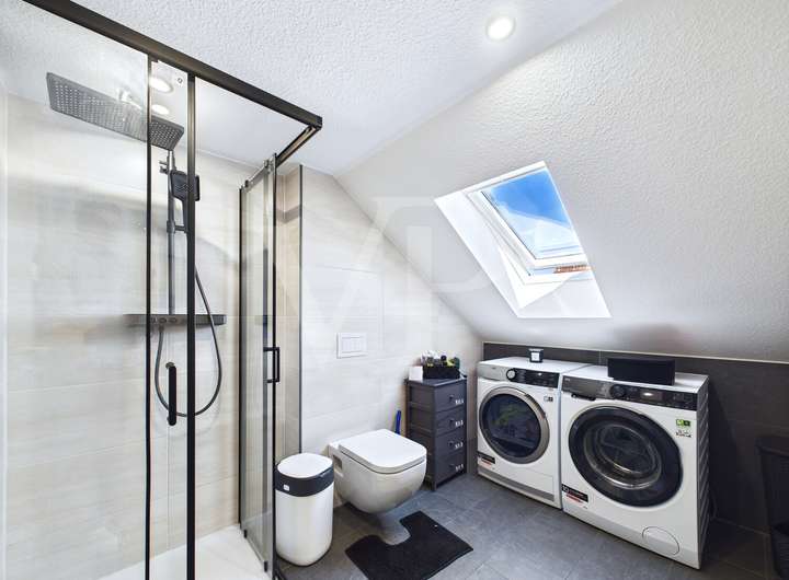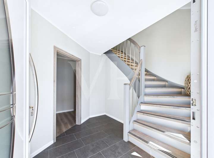 Die Ausstattung umfasst zwei hochwertige Einbauküchen (je eine pro Etage), moderne Tageslichtbäder mit Dusche und Badewanne, hochwertige Bodenbeläge sowie eine elegante Holztreppe mit integrierter LED-Beleuchtung.