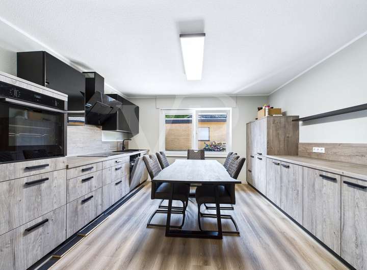 Im Obergeschoss befindet sich eine hochwertige, neu eingebaute Küche und ein modernisiertes Duschbad. Auch das Erdgeschoss beinhaltet eine neue Küche. Das neue Dusch- und Wannenbad befindet sich aktuell noch in der Fertigstellung. Im großzügigen Wohnbereich des Erdgeschosses sorgt ein eingebauter Kaminofen für zusätzliche Behaglichkeit an kühleren Tagen. Der gelungene Grundriss erlaubt zudem eine Nutzung als zwei separate Wohneinheiten – ideal für Mehrgenerationenwohnen oder Arbeiten und Wohnen unter einem Dach.