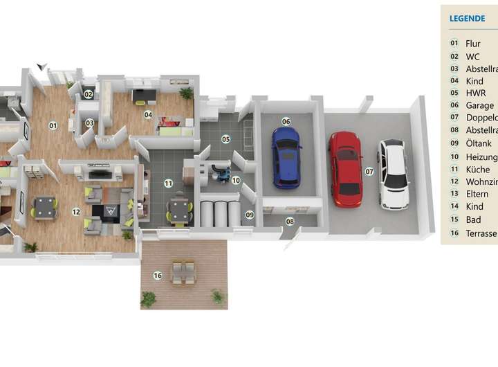 Der Hauswirtschaftsraum kann von außen und von der Küche aus betreten werden. Hier haben Regale, Waschmaschine und Trockner Ihren Platz. Heizungsraum und Öllager liegen hinter dem Hauswirtschaftsraum.