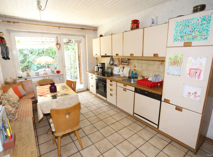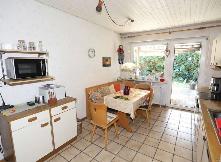 Die Küche verfügt ebenfalls auf einen Ausgang auf die Terrasse. Die Stellmöglichkeiten für die Einbauküche sind gut. Zudem gibt es Platz für eine Essecke.