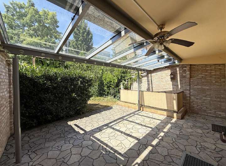 großes Wohnzimmer mit Zugang zur Terrasse mit Glasüberdachung (von 2013), Küche, Esszimmer, Gäste