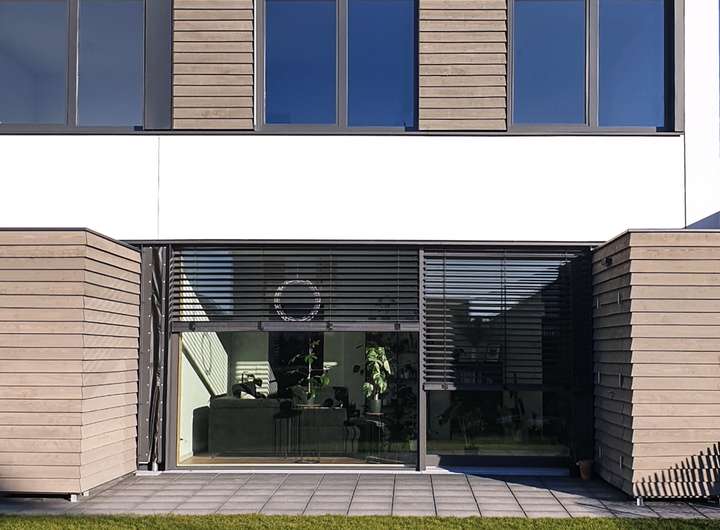 + Holzfassade mit sägerauhem Lärchenholz aus dem Elm