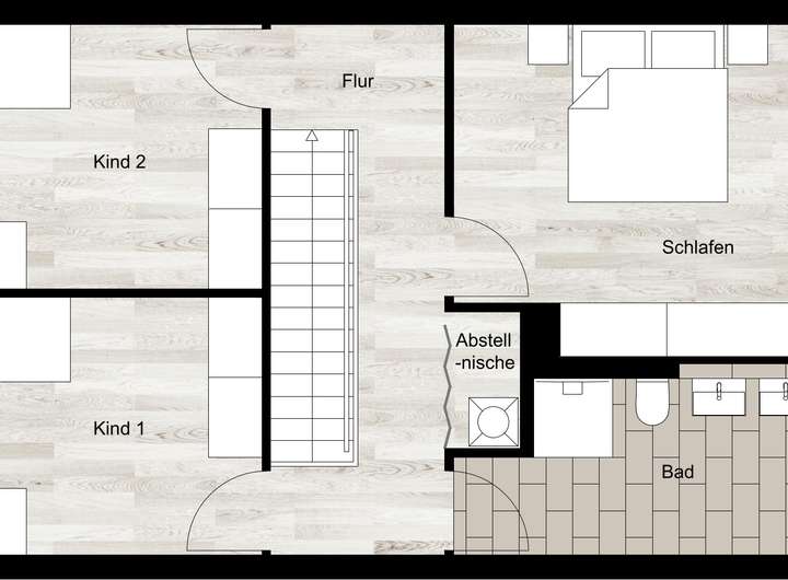Den privaten Bereich mit Schlaf- und Kinderzimmer im 1. Obergeschoss erreicht man über eine Treppe. Das Tageslichtbad auf dieser Etage verfügt über Badewanne und Dusche.