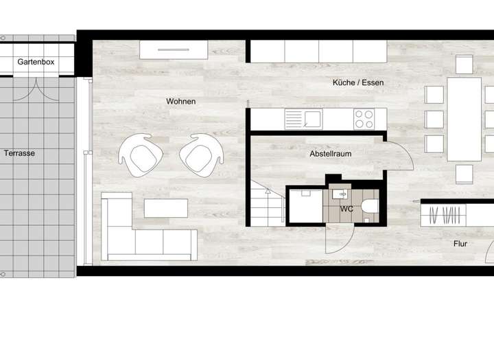Die Wohnung erstreckt sich über das Erdgeschoss und das darüber liegende 1. Stockwerk, sie hat einen eigenen Garten mit Terrasse nach Westen.