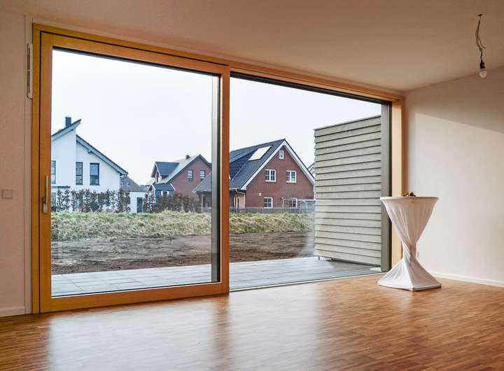 Vom Wohnzimmer aus gelangt man durch eine große Schiebetür direkt in den Garten, eine ideale Situation für Familien mit Kindern. Das Panoramafenster lässt viel Licht in den Wohnbereich und von der offenen Küche aus hat man den Garten gut im Blick.