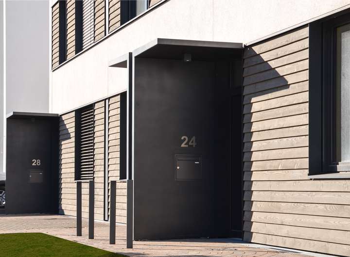 Man betritt die Garten-Maisonette über einen privaten Vorgarten mit Pkw- und Fahrradstellplatz. Die persönliche Hausnummer macht deutlich, dass man hier eigentlich im eigenen Haus lebt.+ Die zukunftsweisende Hybridbauweise verbindet die Vorteile des Massivbaus mit der Ökologie des Holzhauses