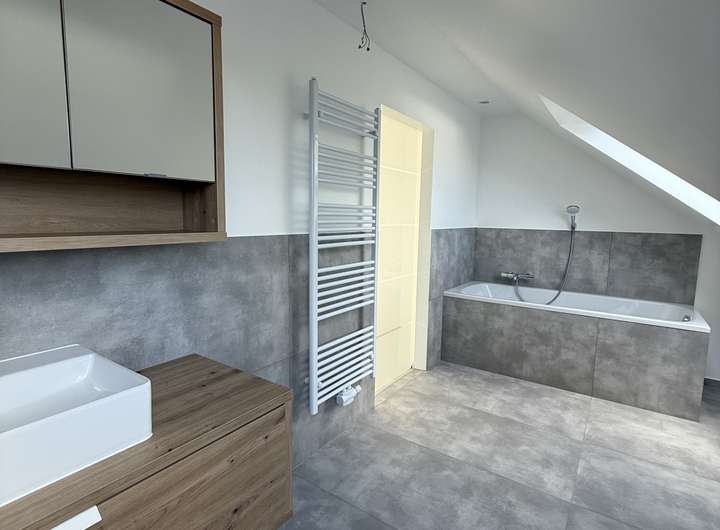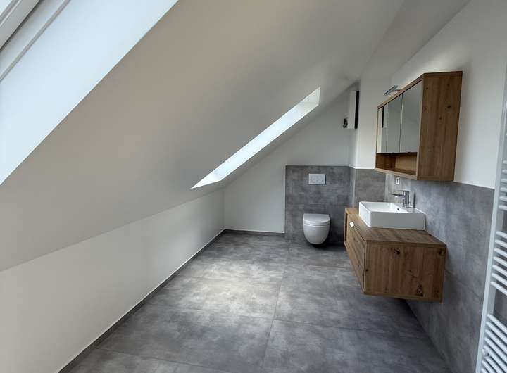 Die Wohnfläche verteilt sich auf circa 135 m² über drei Etagen. Das Erdgeschoss bietet ein großes, helles Wohnzimmer, eine Küche, ein Gäste WC und Flur. Im Obergeschoss befinden sich drei Schlafzimmer und das Badezimmer inkl. moderner begehbarer Wellnessdusche. Im neu ausgebauten Dachgeschoss (anrechenbare Fläche, 35 m²,) mit einer Grundfläche von ca. 50 m² haben ein großes Schlafzimmer, Büro oder ähnlich Platz. Dort befindet sich ein modernes neues Bad inklusive Badewanne. Das Haus ist voll unterkellert und verfügt im Kellergeschoss über 3 Räume, wovon ein Raum mit einem großen Fenster und Tür zum Garten ausgestattet ist. Das Haus ist nach Sanierung als Erstbezug ab 01.11.2025 zu vermieten.