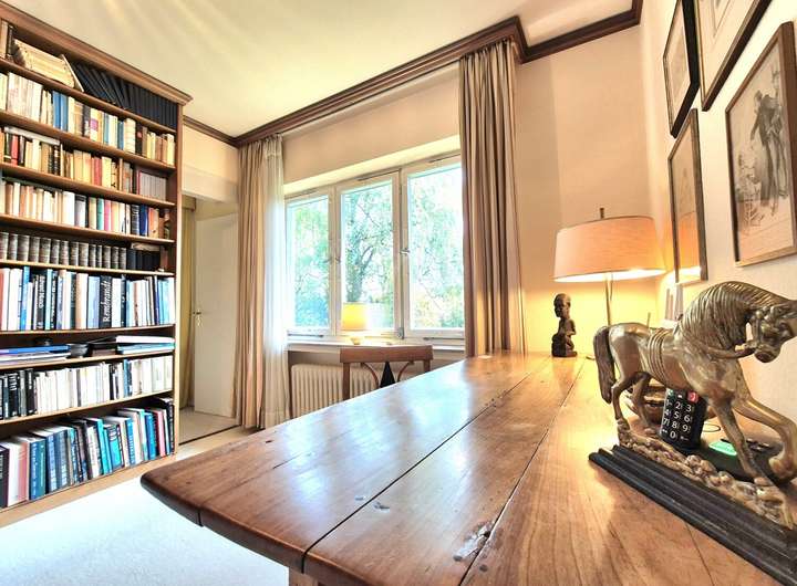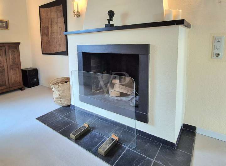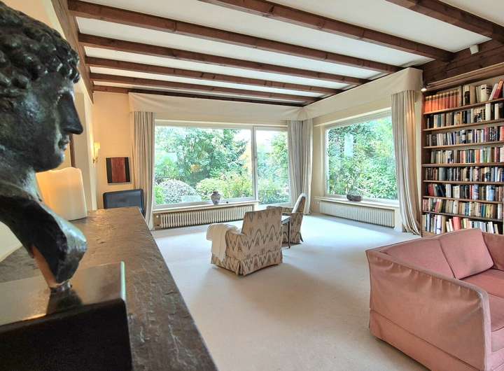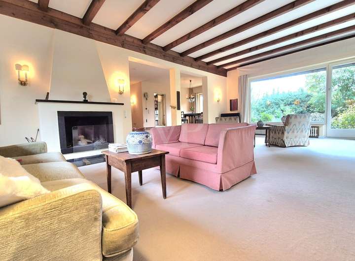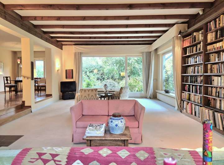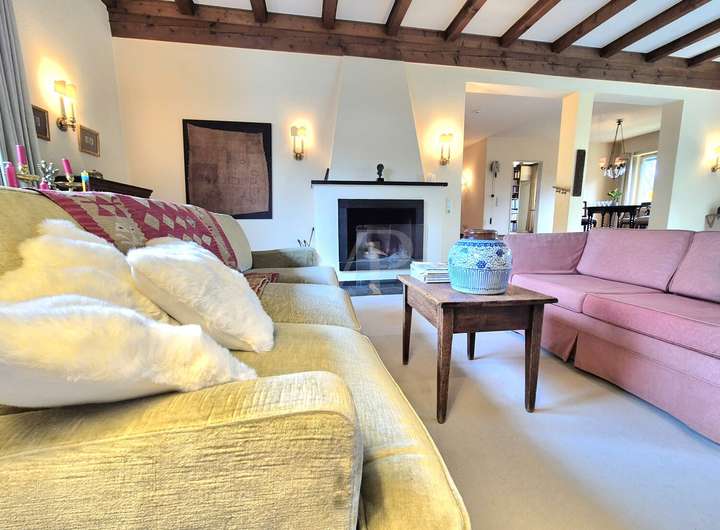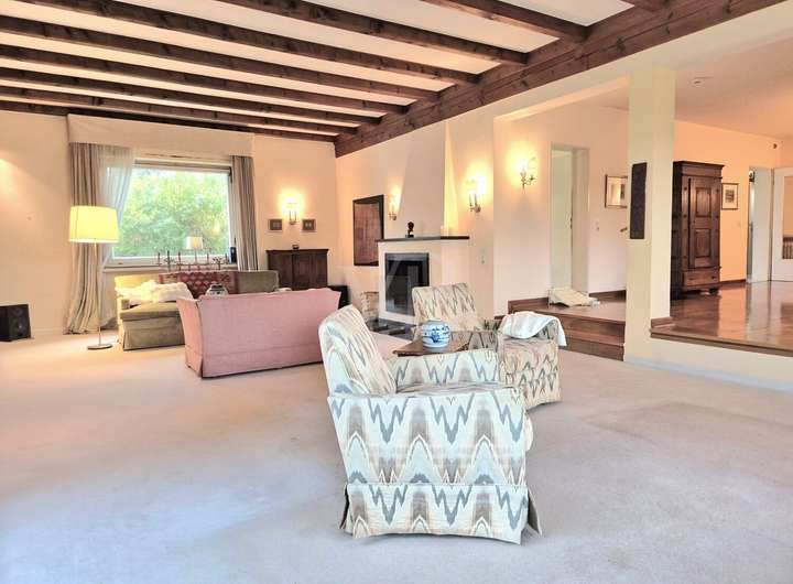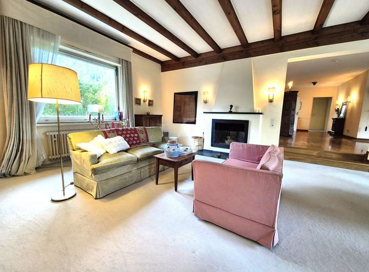 Das Herzstück des Hauses bildet der große, offen gehaltene Wohnbereich im Erdgeschoss. Freigelegte Holzbalken und ein stilvoller Kamin verleihen dem Raum eine warme, wohnliche Ausstrahlung. Große Fensterflächen eröffnen den Blick direkt ins Grüne und lassen viel Licht in den gesamten Wohnraum.