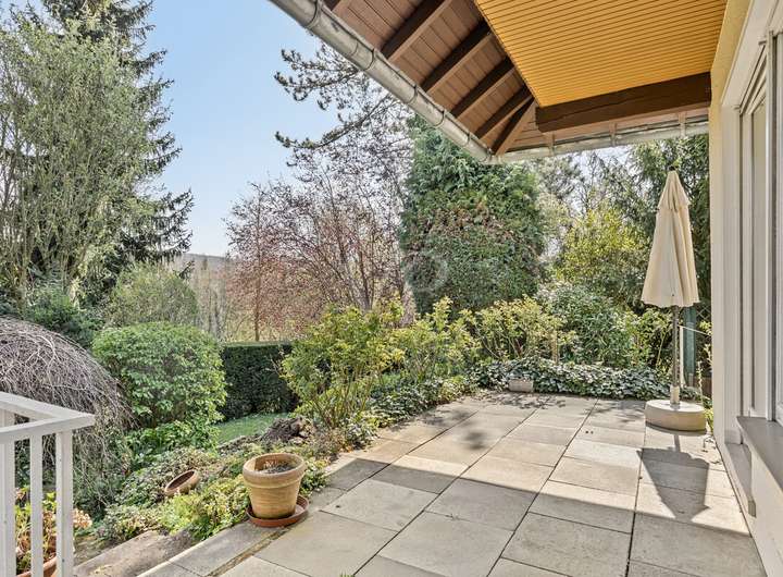 Der schöne Garten der Immobilie ist kaum einsehbar und von viel Grün umgeben. Verschiedene sonnige Sitzbereiche laden zum Entspannen ein.