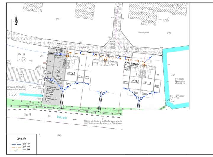 Zum Verkauf stehen insgesamt sechs Grundstücke (ein Flurstück in sechs Parzellen geteilt) für die Errichtung von drei Doppelhäusern mit insgesamt sechs Doppelhaushälften. Die Grundstücksgrößen variieren zwischen ca. 250 m² und 350 m².