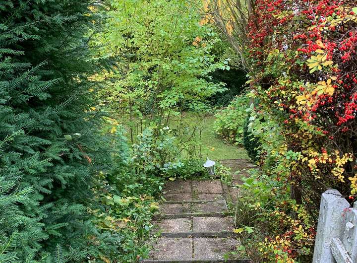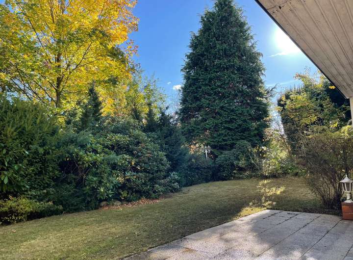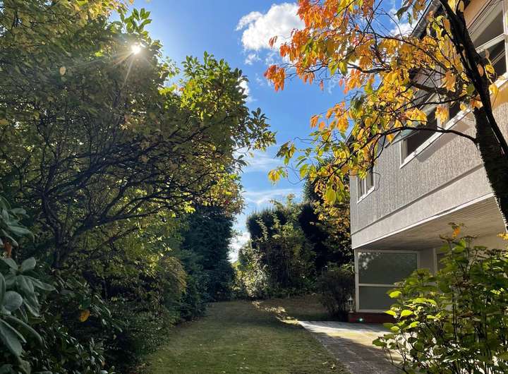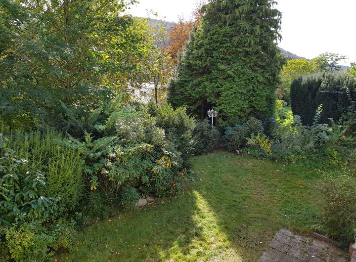 Vom Untergeschoss aus betreten Sie die großzügige, überdachte Terrasse mit sonniger Südwest-Ausrichtung. Der ebene Teil des Gartens ist liebevoll angelegt und bietet viel Platz zum Entspannen, Feiern oder Gärtnern – ein Rückzugsort mit Charme und Raum zur Entfaltung. Der an den Garten angrenzende und zum Grundstück gehörende Hangbereich ist dicht bewachsen und bietet Rückzugsorte für Eichhörnchen und zahlreiche Vogelarten.