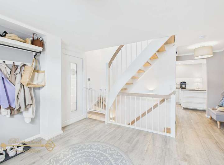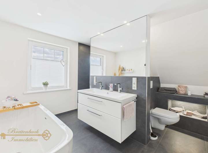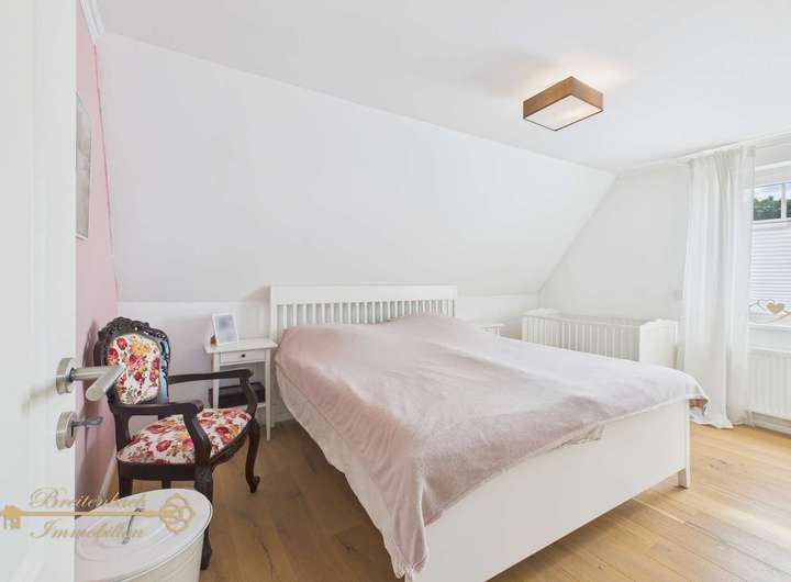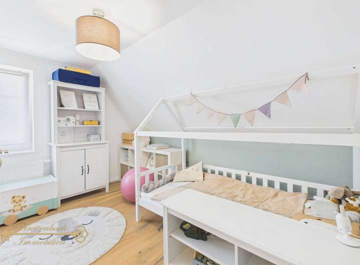 Im Obergeschoss erwarten Sie ein großzügiges Kinderzimmer, ein stilvolles Badezimmer mit freistehender Badewanne, Regendusche & Doppelwaschbecken, ein Elternschlafzimmer, ein kleines Büro sowie ein wohnlich ausgebauter Dachboden, der aktuell als begehbarer Kleiderschrank genutzt wird. Der Zugang erfolgt über eine edle Massivholz-Wendeltreppe.