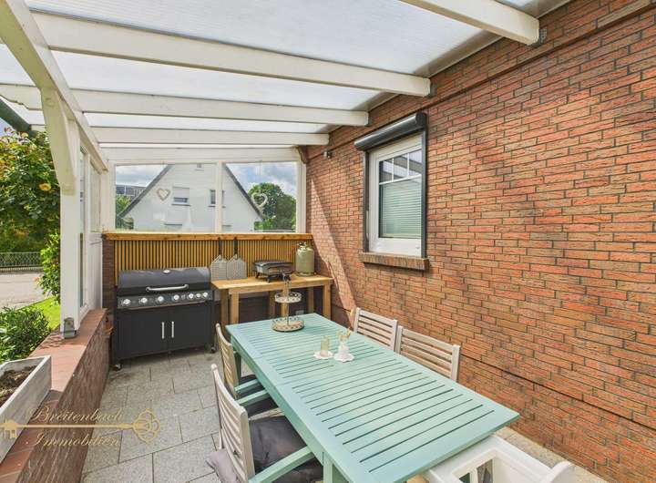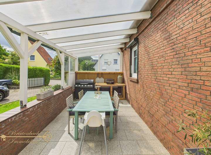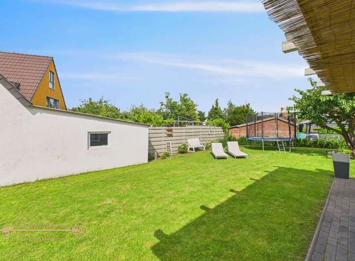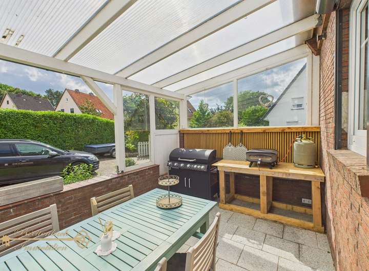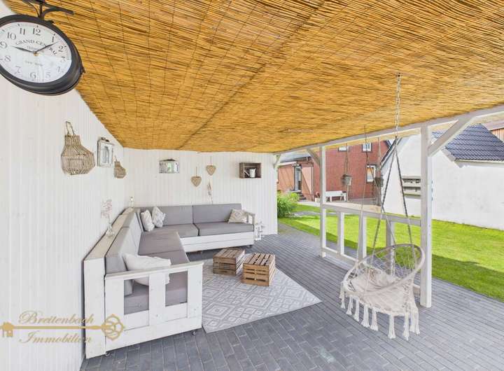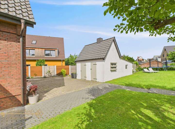 Auf dem ca. 970 m² großen Grundstück befindet sich ein liebevoll angelegter Garten mit überdachter Sitzecke – ideal für entspannte Sommerabende. Für zusätzlichen Stauraum gibt es ein Gerätehaus, das auch als Werkstatt genutzt werden kann. Eine massiv gebaute Garage, harmonisch in Klinkeroptik zum Haus passend, bietet einen geschützten Stellplatz.
