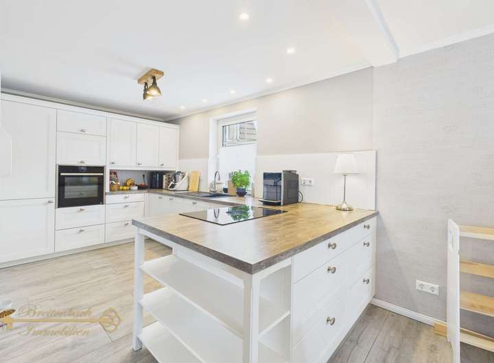 • Moderne Einbauküche mit Kochinsel zur Essecke