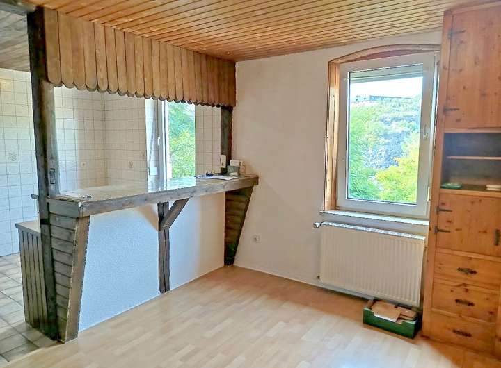 Großzügiger, nur durch Fachwerkbalken stimmig über das gesamte Stockwerk abgetrennter Wohnbereich, mit offener Küche und einer Frühstückstheke. Hier befindet sich ein handgefertigter Einbauschrank aus Echtholz. Die Raumhöhe beträgt ca. 2,40 m. Im Preis ist keine Einbauküche enthalten. Gegen Aufpreis ist eine Teilmöbilierung (auch mit Einbauküche) möglich.