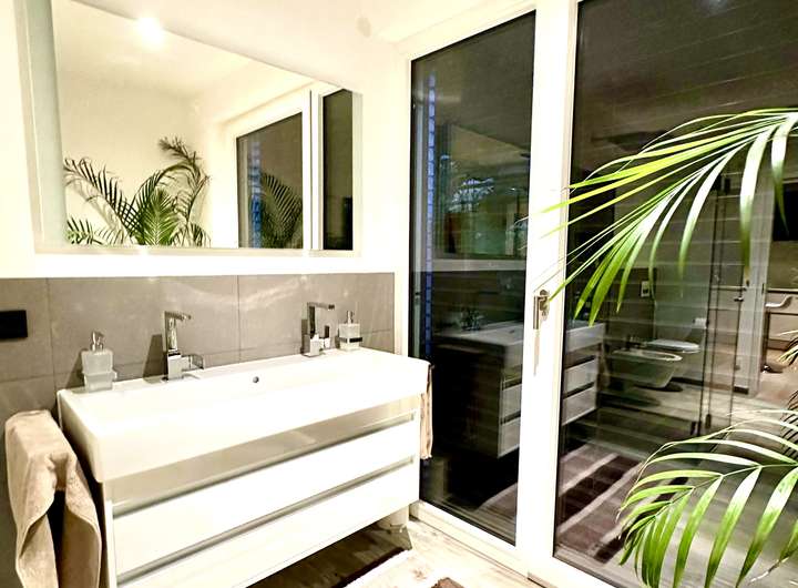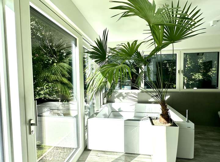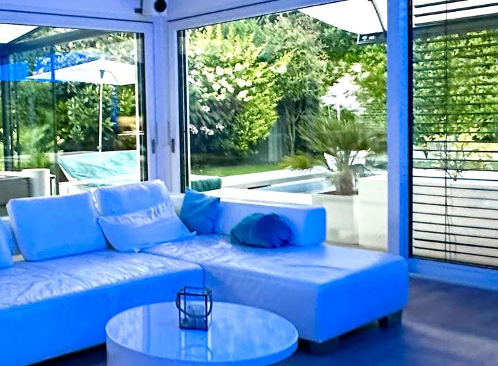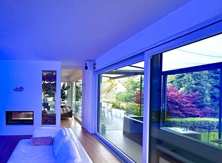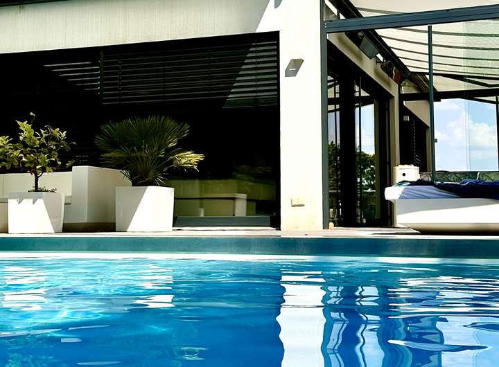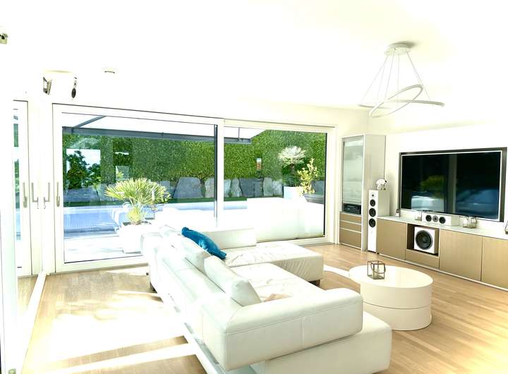 In dieser architektionisch durchdachte Villa verschwimmt der Innen- und Aussenbereich und lädt mit ihren grosszügigen Terrassen und Pool, Whirlpool, einem Wellness- Trainings- und Saunabereich jeden Tag dazu ein, den eigenen Alltag hinter sich zu lassen und zu entschleunigen.