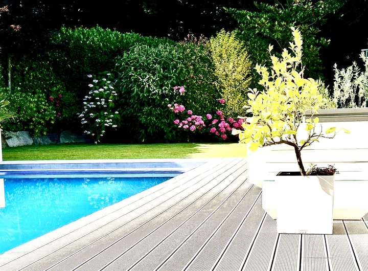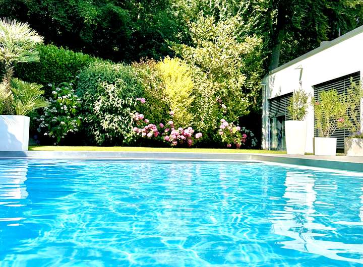 grüner Garten mit Gewächshaus und grosszügigem Pool