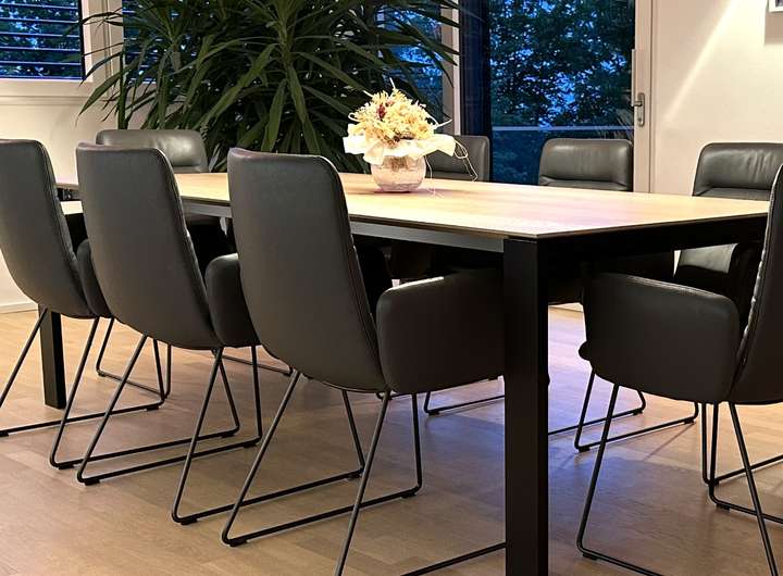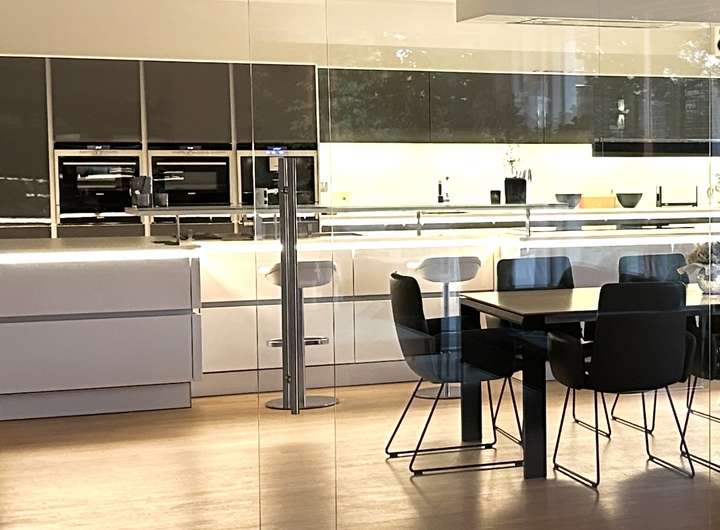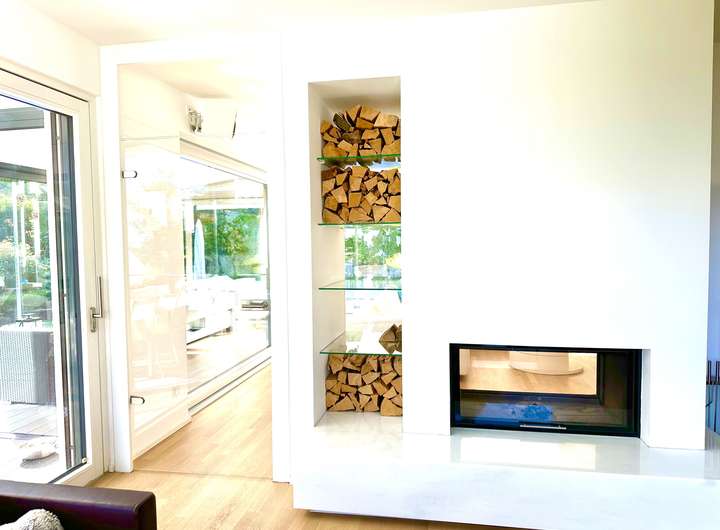 Sie wurde liebevoll zurückhaltend in einem zeitlosen und hochwertigen Understatement gestaltet und hat als Herzstück des Hauses ein sehr grosszügig gestalteten Küchen-, Ess- und zweiteiligen Wohnbereich mit offenem Kamin zu beiden Seiten.