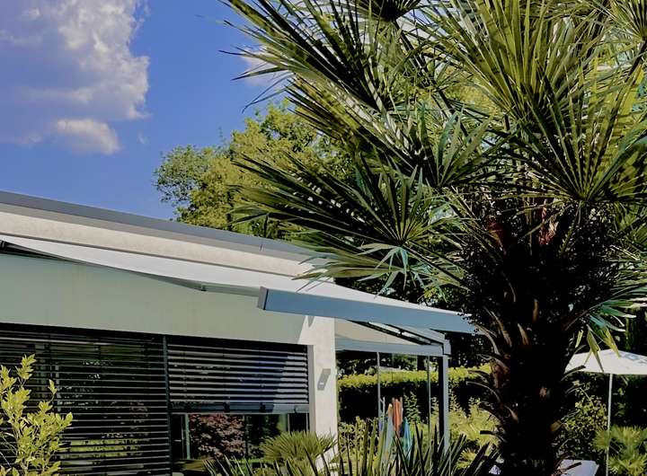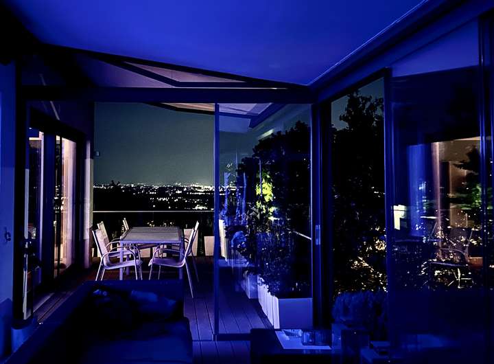 Grosse Terrassen auf Ost- Süd- und Westseite mit Glashaus Infrarot- Heizelementen, Verschattung + dimmbaren LED-Leuchten, komplett (ab-)schliessbar oder aufschiebbar