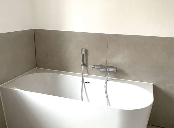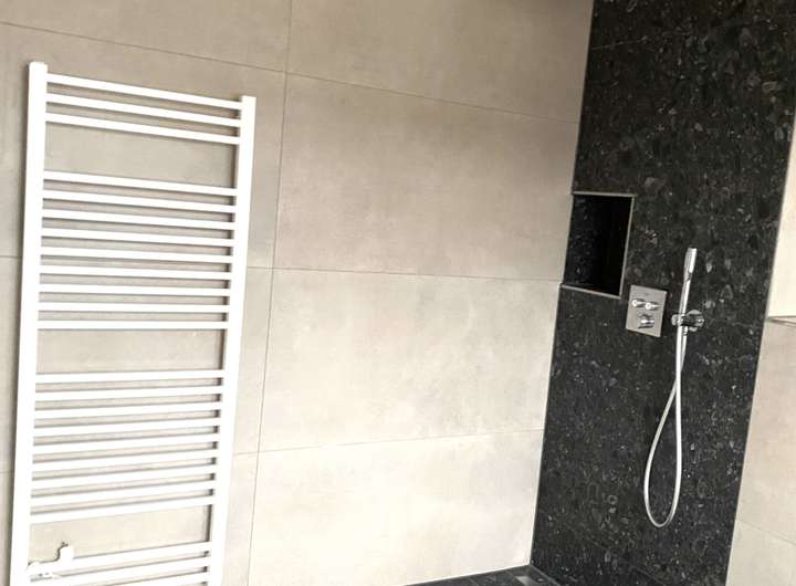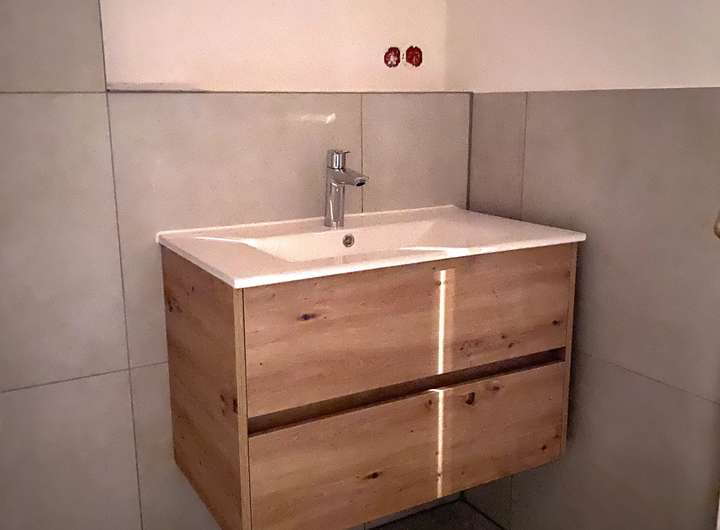 Edles Escheparkett im Fischgrätmuster, stilvolle Fliesen und eine Fußbodenheizung runden das Erdgeschoss ab.
