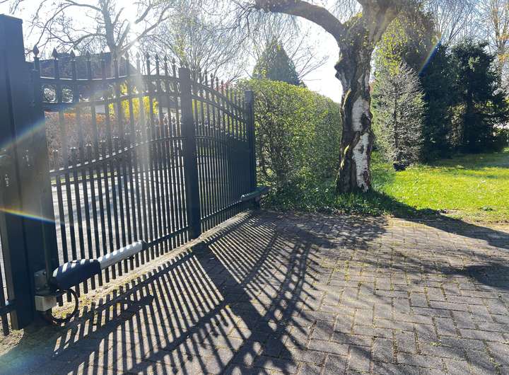• Hochwertige elektrische Toranlage mit Doppelflügel und integriertem Zugang