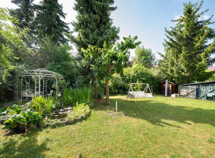 Ein besonderes Highlight ist der gepflegte Garten mit Terrasse, Zierteich und altem Baumbestand – eine grüne Oase mit viel Privatsphäre, die zum Entspannen, Gärtnern oder geselligen Beisammensein im Freien einlädt. Die Süd-West-Ausrichtung sorgt für optimale Lichtverhältnisse und eine angenehme Wohnatmosphäre im gesamten Haus.