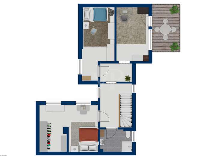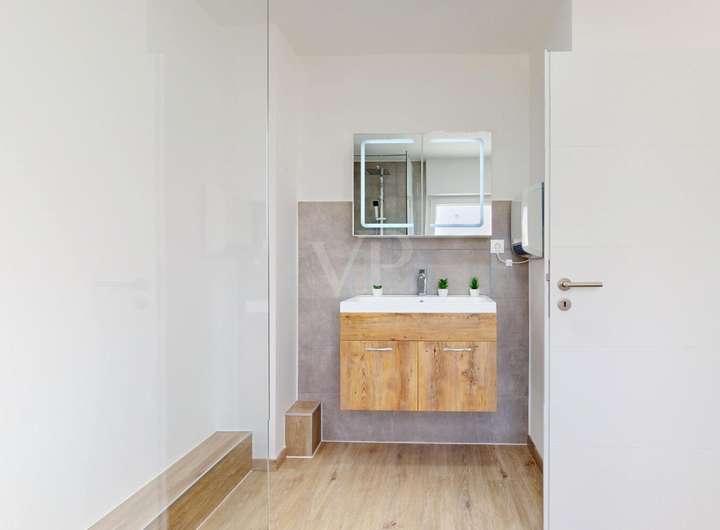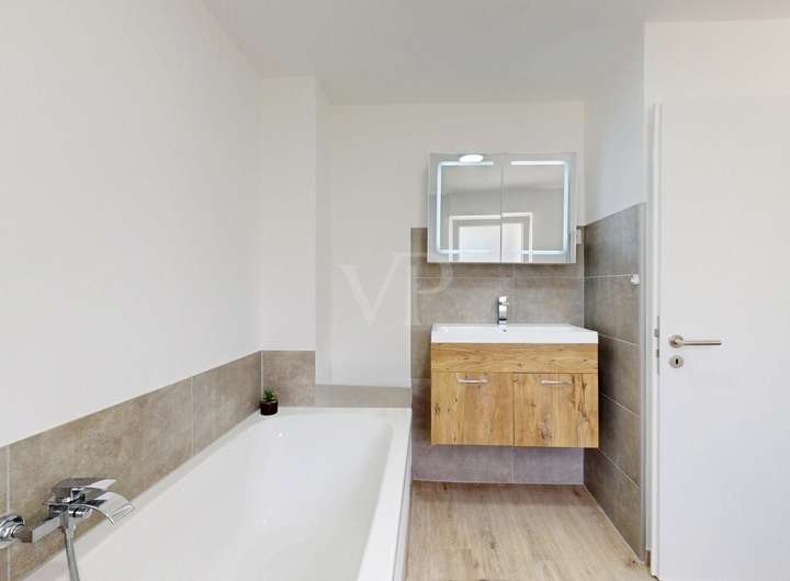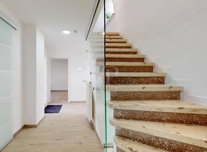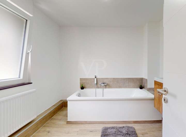 Die beiden modern gestalteten Bäder – eines mit Dusche, eines mit Badewanne – bieten Platz und Flexibilität für die ganze Familie. Ein separater Hauswirtschaftsraum erleichtert die täglichen Abläufe und schafft wertvolle Ordnung. Im Obergeschoss erwartet Sie ein großzügiger Balkon mit traumhafter Aussicht, perfekt für den ersten Kaffee am Morgen oder laue Sommerabende, geschützt durch eine elektrische Markise.