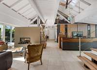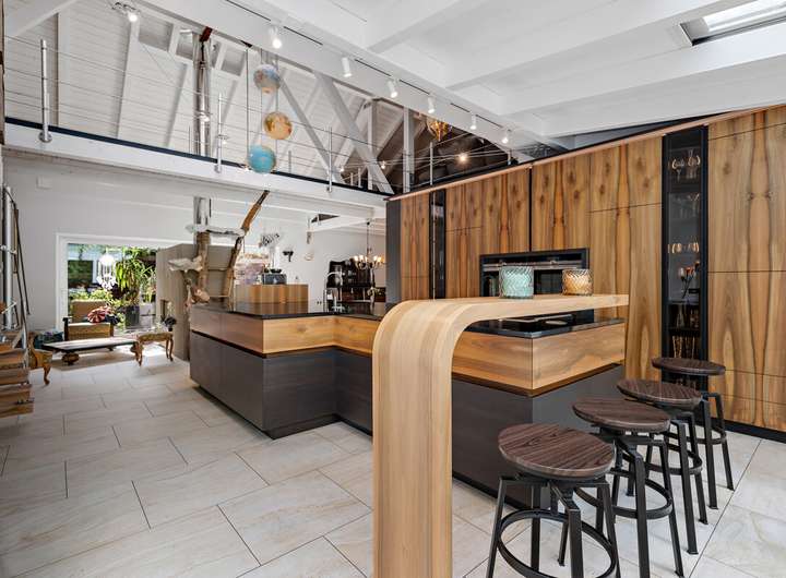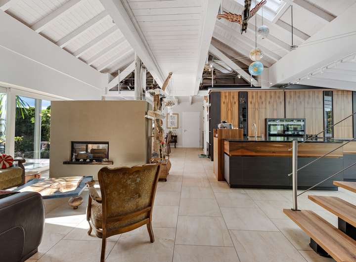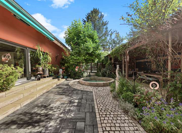 Dieses Anwesen vereint stilvolle Eleganz mit einer idyllischen Naturkulisse und bietet ein Wohnambiente der Extraklasse. Die umfassende Modernisierung im Jahr 2020 verlieh dem Objekt ein zeitloses, anspruchsvolles Design: Großzügige Raumhöhen, offene Grundrisse und bodentiefe Fenster schaffen eine lichtdurchflutete, weitläufige Atmosphäre. Ein besonderes architektonisches Highlight ist die Brücke über dem Wohnbereich, die auf raffinierte Weise die Galerie-Bibliothek mit dem Büro im Dachgeschoss miteinander verbindet. Die weitläufigen Fensterfronten eröffnen faszinierende Ausblicke auf den kunstvoll gestalteten Garten und unterstreichen die harmonische Verbindung von Innen- und Außenbereich.