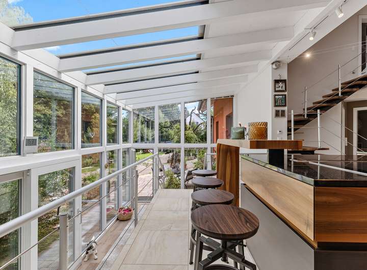 Der weitläufige Wohnbereich vereint erstklassigen Wohnkomfort mit klarer, zeitloser Ästhetik. Ein angrenzender Wintergarten erweitert die Wohnfläche und bietet zu jeder Jahreszeit einen herrlichen Blick ins Grüne. Hochwertige Materialien und eine klare Linienführung prägen die exklusive Ausstrahlung des gesamten Hauses.