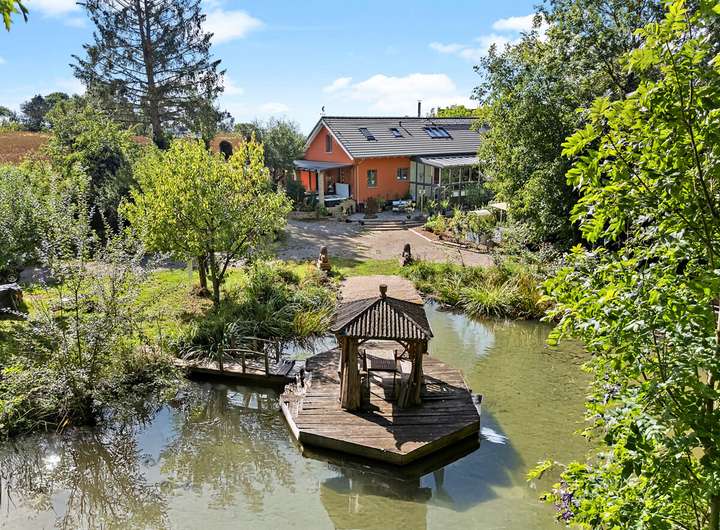 Das rund 2.320m² große Grundstück umfasst nicht nur die Villa, sondern auch einen gepflegten Gartenbereich welcher zum Entspannen einlädt. Die Außenanlagen werden durch einen idyllischen Weiher mit Pavillon auf einer kleinen Insel ergänzt, womit sich die nutzbare Fläche um weitere 680m² erweitert. Damit stehen insgesamt mehr als 3000m² als private Oase zur freien Verfügung. Sie bietet einen Rückzugsort inmitten der Natur und rundet das außergewöhnliche Wohnkonzept perfekt ab.