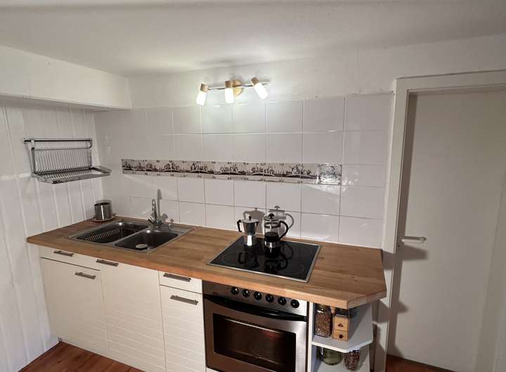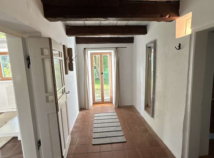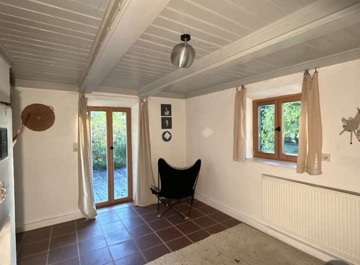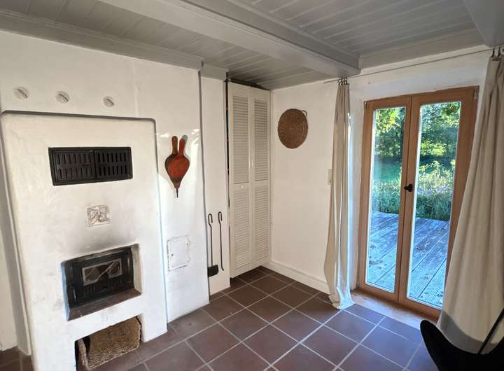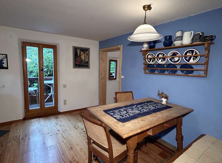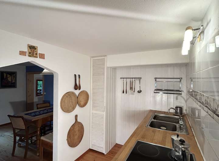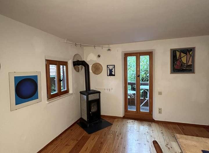 Das Haus besteht aus drei Stockwerken, im Erdgeschoss befinden sich zwei Wohnräume mit gemütlichem Kachelofen und Zugang zu zwei Terrassen, eine Küche mit Holzofen mit Kochfunktion von 2016 und einem Bad.